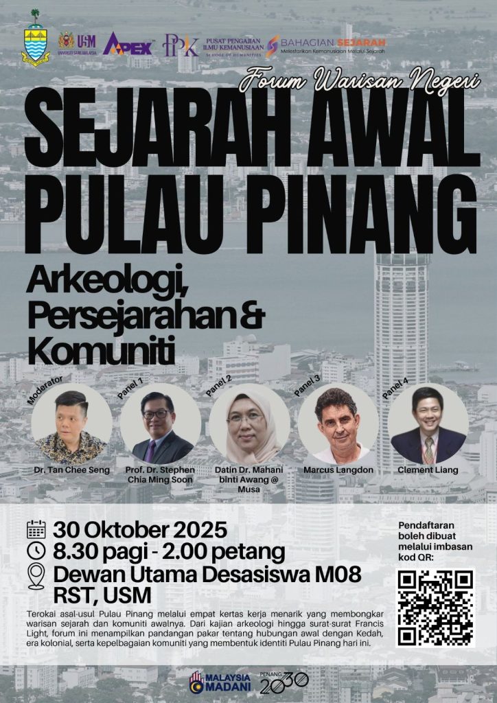 PULAU PINANG, 30 Okt — Forum Warisan Pulau Pinang 2025 bertemakan “Sejarah Awal Pulau Pinang: Arkeologi, Persejarahan dan Komuniti” telah berlangsung dengan jayanya pada Khamis, bertempat di Dewan Utama, Desasiswa M08 RST, Universiti Sains Malaysia (USM). Forum yang bermula jam 8:30 pagi hingga 2:00 petang itu menghimpunkan para sarjana dan pengkaji warisan bagi menyelusuri lapisan sejarah awal Pulau Pinang dari perspektif arkeologi, kolonial dan kemasyarakatan.