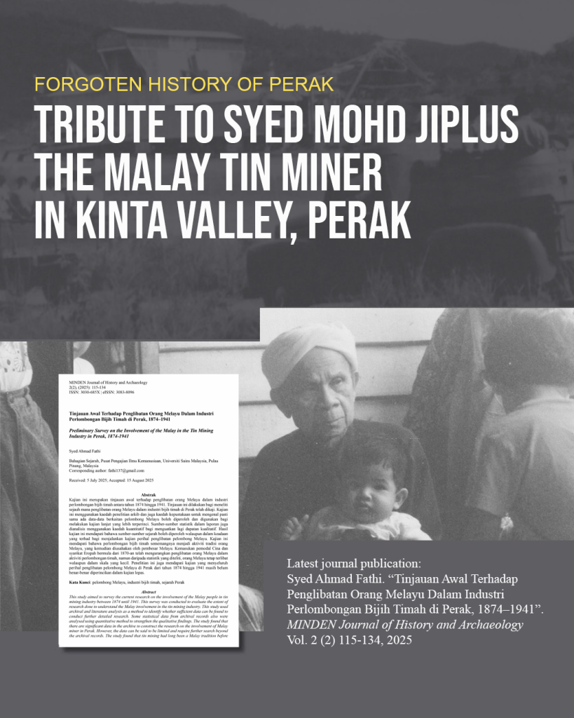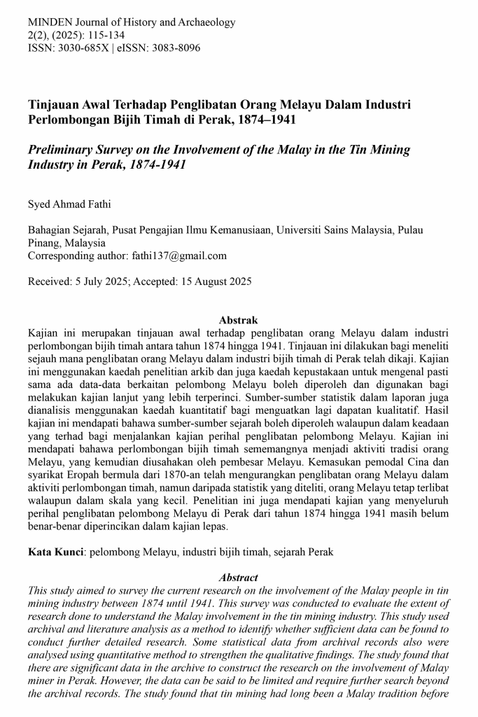 Hari ini akhirnya MINDEN: Journal of History and Archaeology telah menerbitkan artikel saya yang bertajuk “Tinjauan Awal Terhadap Penglibatan Orang Melayu Dalam Industri Perlombongan Bijih Timah di Perak, 1874–1941″ dalam versi digital.